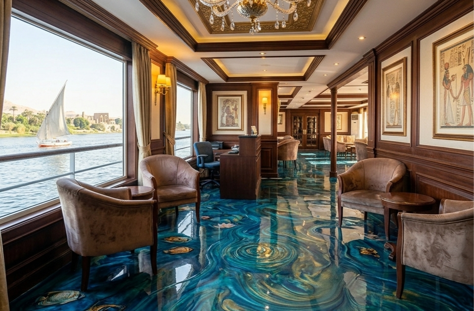دمج الفخامة بالاستدامة في مشروع نايل كروز؛ حيث نفذنا 1600 متر مربع من أرضيات الإيبوكسي عالية اللمعان، بتصميم انسيابي خالي من الفواصل يجمع بين المظهر المرآتي الفاخر والمقاومة الفائقة للاستخدام الكثيف، لتقديم تجربة سياحية فريدة على ضفاف النيل.